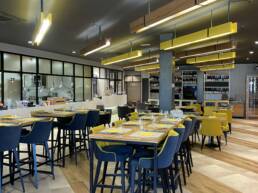 Découvrez notre restaurant et laissez vous porter par notre décoration intérieure au design d’esprit entrepôt. Du béton brut ou béton ciré, des touches de marbre de carrare sur les comptoirs, du chêne massif, des plafonds en fibralith paille pour l’isolation phonique, du grillage et du métal noir. Nous pouvons accueillir jusqu’à 150 couverts et nous vous offrons 50 couverts de plus en été, sur notre belle terrasse.
