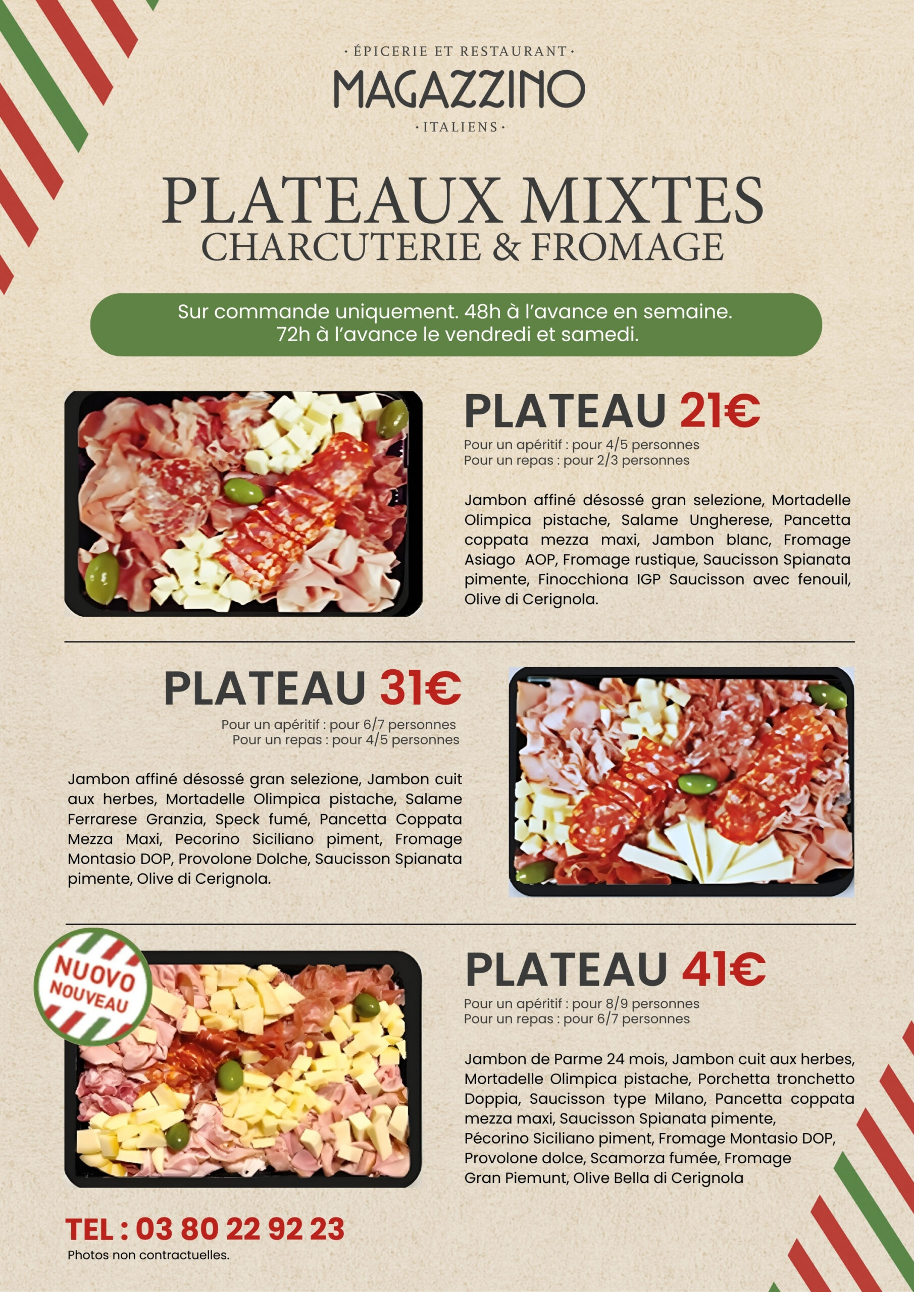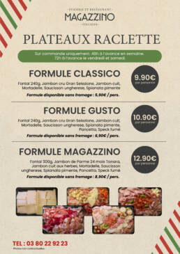 Au sein de notre coin traiteur, il est possible de commander des plateaux de charcuteries, de fromages, de raclettes… N’hésitez pas à demander plus d’informations en boutique ou par téléphone au :